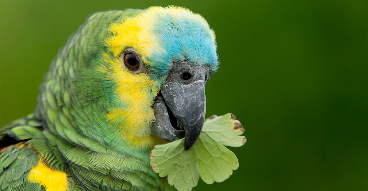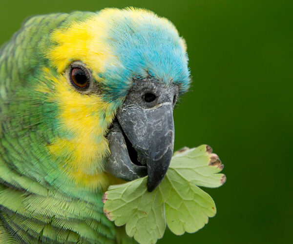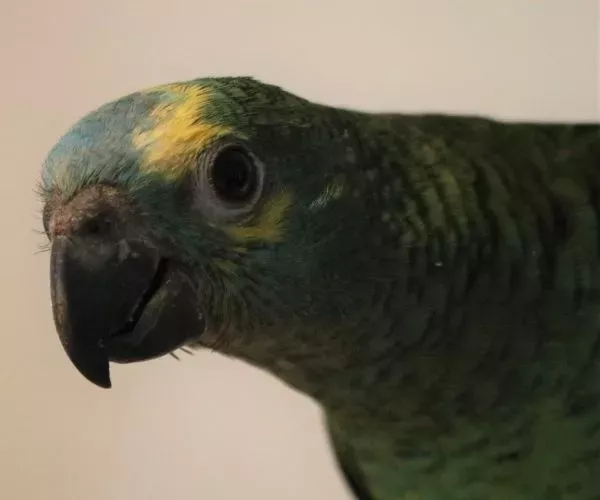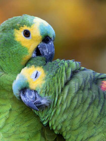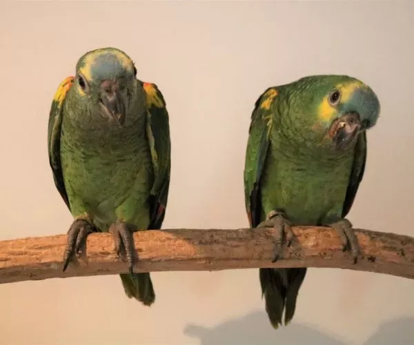 Oiseaux de couleur verte, originaires d’Amérique du Sud, il existe deux espèces de perroquet Amazone, la 1ère à front bleu, plus grande (37 cm) et la 2nd à front blanc plus petite (26 cm). L’Amazone à front bleu a une couleur jaune prononcée sur la face et la tête ainsi qu’un masque bleu. Il n’existe aucune distinction entre le mâle et la femelle et un test ADN est nécessaire pour déterminer le sexe.